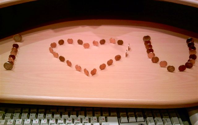 Идея проста: Из монеток, стоящих вертикально, выложить "I (сердечко) U"