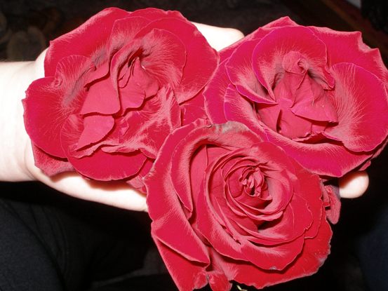 Три красных розы в белых капельках дождя,