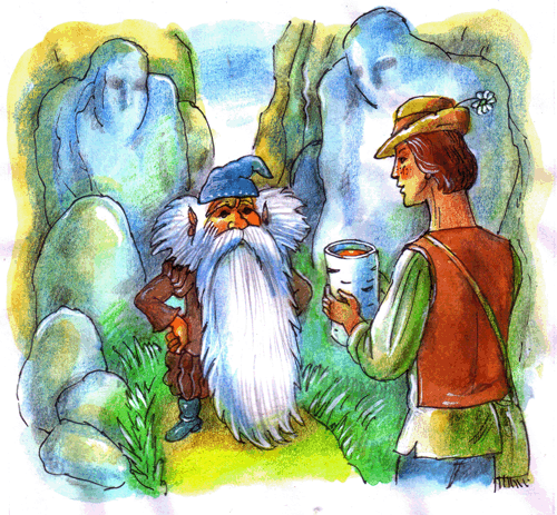 Огромная, доходящая до земли белая борода, закрывала почти всё его лицо, и только были видны чёрные, как смоль, глаза. На голове гнома была тёмно-синяя, расшитая золотом шапочка, замшевая куртка и такие же штаны светло-коричневого цвета, а на ногах изящные сафьяновые сапожки с накладками золота.