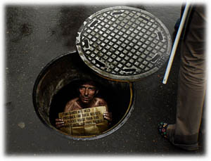 Открыв чугунный люк, всем налегая весом