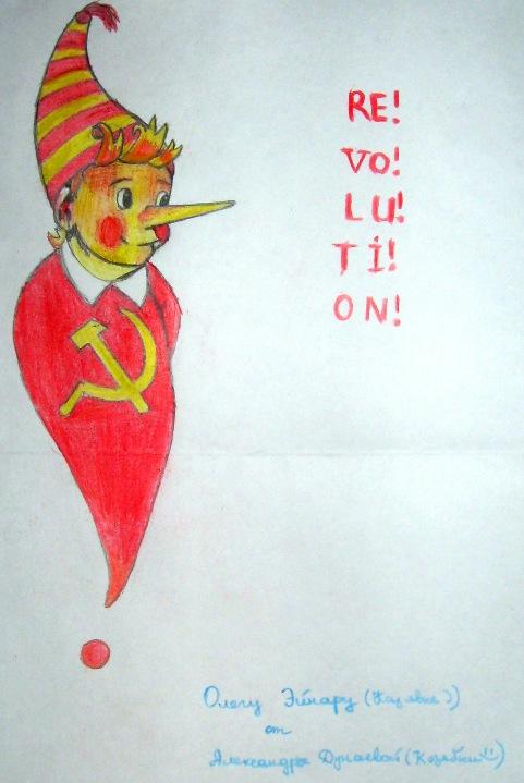 Все обращаются глазами к небу, и в это время тучи нежданно для всех вынимают солнце и освещают парк Маяковского им. Динамики на столбах вдруг начинают призывно играть мотив песенки о Буратино, но со словом «Re-vo-lu-сion» в припеве и сыгранной в стиле Grunge-core. А потом громыхает какой-то бойкий марш и парк наполняют одинаково улыбающиеся китайские туристы с брошюрами стихов Маяковского, писанных красными иероглифами, лесенкой. И где только взяли, а?
