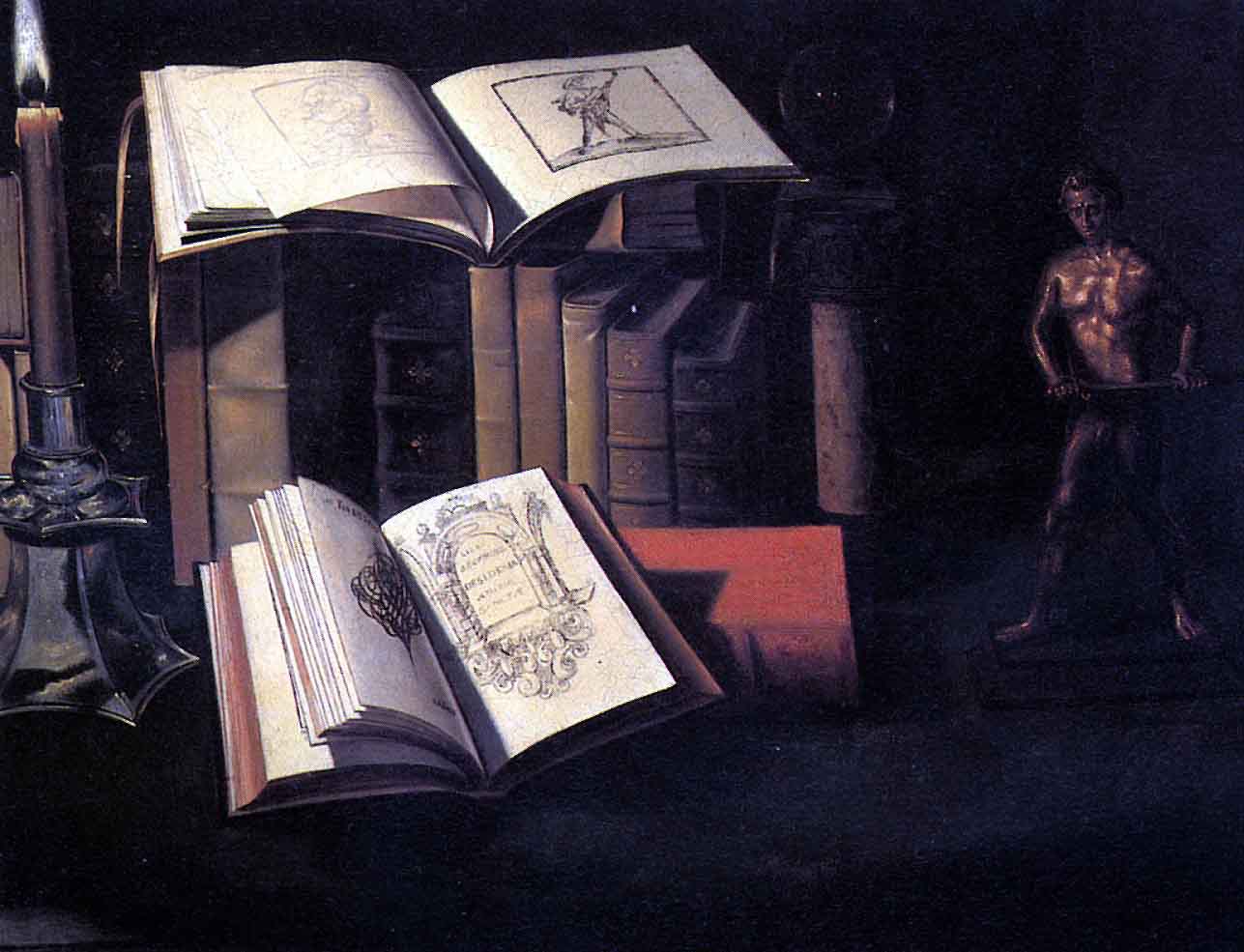 Натюрморт с книгами, свечой и бронзовой статуей