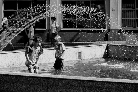 В брызгах фонтанов купаются дети,