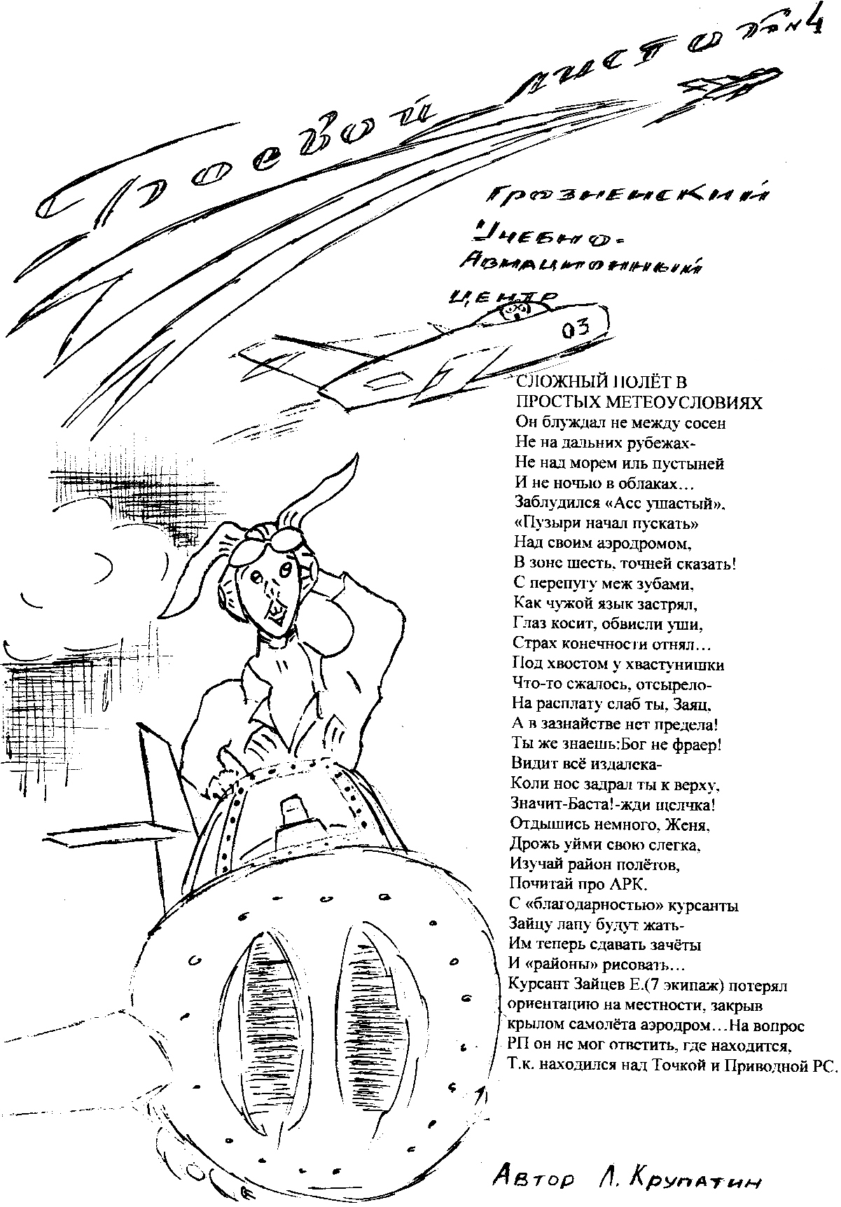 Так вот! Это приложение к рассказу "Особоопасный!". Этот "заяц", за мои стихи в "Боевом листке" очень обиделся на меня. А когда я вернулся в часть(ГРОЗНЕНСКИМЙ УЧЕБНЫЙ АВИАЦИОННЫЙ ЦЕНТР), он был счастлив, что меня подстерегла беда. А в то время ДОСААФ возглавлял уже АСС Покрышкин (Трижды Герой), который в первом своём боевом вылете лично сбил советский бомбардировщик... Покрышкин меня понял и подтвердил, что я достоин "Поощрения".Л.КРУПАТИН.