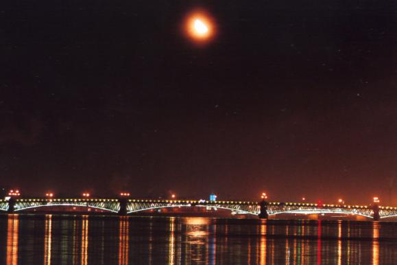 ночь,Троицкий мост,в небе светит луна.