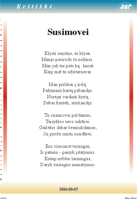 Susimovei (Облажался,- стихотворение принадлежит серии нескольких иронических произведений, созданных в противовес неадэкватному поведению сельского старосты.., как мгновенная реакция на его поступки и тогда же было вывешено публично на доске объявлений.., - народу нравилось, но староста их быстро срывал..), на литовском языке,