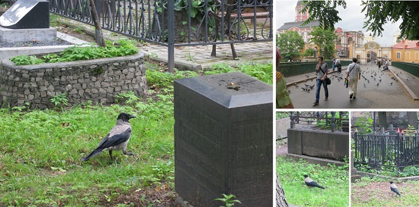 во время пребывания на кладбище Александро-Невской лавры нашим экскурсоводом была обыкновенна ворона: как только мы свернули с центральной аллеи влево, рядом появилась она и водила нас чётко по линиям давних захоронений, терпеливо дожидаясь, пока мы ознакомимся с надписями на табличках памятников, пока вновь не вывела на центральную аллею. Вот такая умничка! Ну, конечно, в благодарность, мы угостили её печенюшкой и конфетками. Приняла! Санкт-Петербург, 07.07.2013 г.