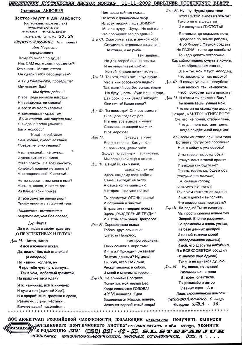 публикует ПРОДОЛЖЕНИЕ НАЧАЛА(!) ПЬЕСЫ Станислава ЛЬВОВИЧА Доктор Фауст и дон Мефисто - СОТВОРЕНИЕ ЧЕЛОВЕЧЕСТВА...