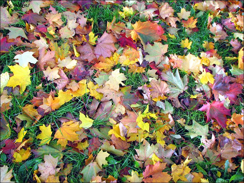 Листья разноцветные на земле лежат.
