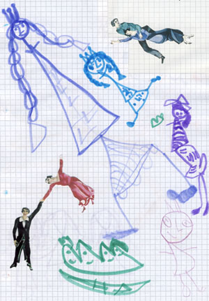 Рисунок внучки Машеньки, когда ей было 3 года, испорченный дедом, впустившим в него летащих людей из картин Марка Шагала.