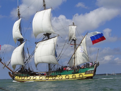 вздымает мачты парусный фрегат.