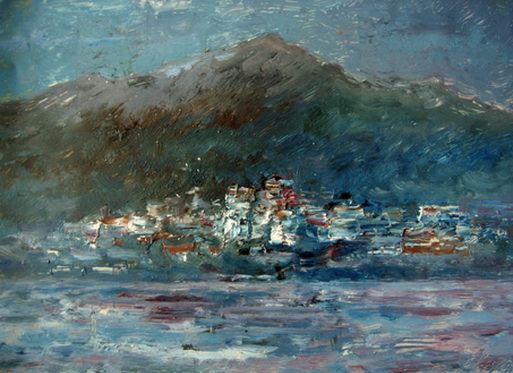 туман скрывает берег моря и дома,