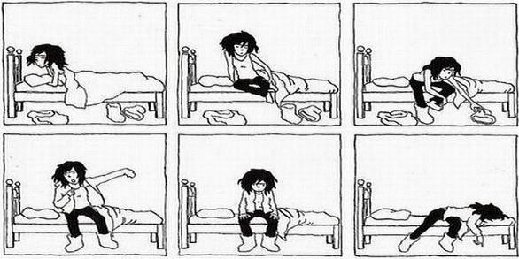 В 7.00 утра звонит будильник на сотовом. Хочется выкинуть его подальше! Одной рукой выключаешь сотовый и заваливаешься дальше спать, при этом мысленно говоришь себе: «На пять минут...» Так нет же! Проспишь ещё минут тридцать, а то и больше, пока кто-то из домашних тебя не разбудит. Сядешь, лениво подумаешь, какой сегодня день недели, придёшь к выводу, что понедельник. Тихо вздохнёшь об ушедшем воскресенье. Опустишь ногу и, конечно, не попадёшь в тапку. Сидя потянешься, сладко зевнёшь. Лениво оденешься, не сползая с любимой кровати. Помечтаешь об Обломовке. Посмотришь на часы. И в лёгкой уверенности, что всё успеешь, пойдешь завтракать. Постепенно просыпается мозг. ты быстро глотаешь кусочек бутерброда, уже на ходу запивая чаем, и бежишь краситься…Нет, нужно умыться! Проведёшь мокрой рукой по лицу пожалуй, этого достаточно. Посмотришь на себя в зеркало, наконец-то продерешь сонные глаза. Слегка подкрасишь ресницы и губы. Поймёшь, что до начала урока -15 минут. Быстренько оденешься, спустишься во двор. Вспомнишь, что сегодня физкультура. Взбежишь по лестнице обратно, возьмёшь сменку, крикнешь: «Нас не догонят!» и побежишь в школу. И тебе уже наплевать на гололёд, темноту и на перерытые дороги! Ты наконец-то понимаешь, что думать надо было раньше. По ходу дела ты вспоминаешь, что пару нужных сегодня учебников ты забыла, но полдороги уже пройдено. А до звонка всего пять минут! И ещё полдороги…А ещё нужно добежать, пройти мимо дежурных, найти свободный крючок в гардеробе и, кроме того, найти кабинет. Пожалеешь о том, что бегала за сменкой. И побежишь дальше в школу, на ходу повторяя стихотворение. Через какое-то время после звонка ты наконец-то добираешься до школы. Обежав все этажи в поисках своего класса, ты неожиданно понимаешь, что сегодня ко второму уроку, и что можно было поспать лишних полчаса.…Но ничего, поспать можно и на втором уроке, и на третьем. Главное - проснуться к последнему, чтобы со счастливой улыбкой отправиться домой. Угадайте, зачем? - спать!..