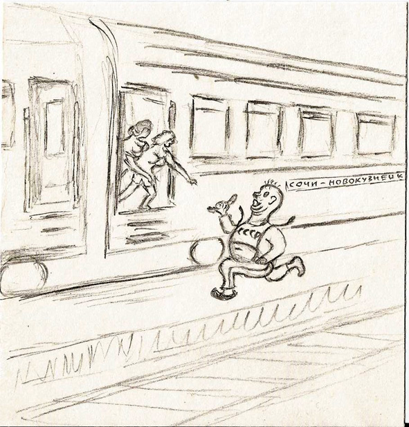 Я быстро запрыгнул, прошёл между проводницами и задержался, обеспокоенный запоздавшим бригадиром и такой неожиданной скоростью поезда. Бригадир спрыгнул с перрона на шпалы первого пути, но у него расстегнулся тапок на «липучках» и остался на путях. Бригадир быстро обернулся и нагнулся за тапком, но у него одновременно от веса живота отстегнулись обе подтяжки. Он на лету подхватил одной рукой падающие штаны, другой тапок, выскочил на платформу и бегом за поручнями вагона. Он догнал наши ступеньки, но руки заняты. Он бросает тапок в вагон, девчонки – проводницы зачем-то тянут к нему руки, а он схватившись одной рукой за поручень сначала поставил одну коленку на нижнюю ступеньку, потом другую, а девчонки достав его руками за майку с узкой прорезью для головы, потащили вверх, перекрывая ему майкой дыхание. Из последних сил, с красным от удушения и волнения лицом бригадир встал на ноги, поднялся на площадку тамбура, опустил майку с шеи, натянул её на круглый живот, поднял с колен спущенные штаны. Достав платок, держа штаны одной рукой, другой, трясущейся рукой он вытер с лица и шеи пот, лившийся в три ручья и гаркнул на девчат: