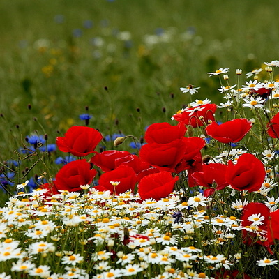 В красных шапках качаются маки.