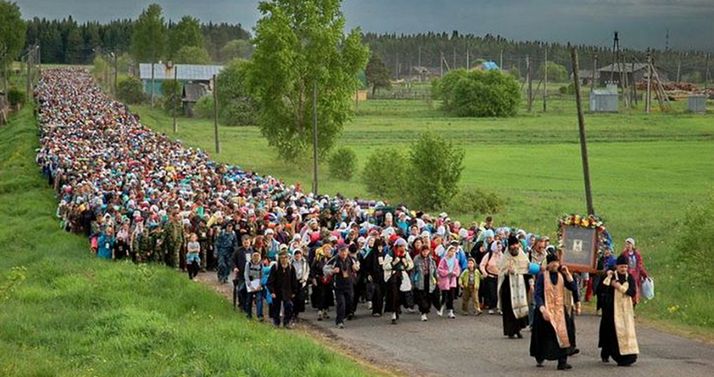 * - Ежегодно, 3 июня, многие тысячи паломников, не только кировчан, но и православных людей из многих регионов России выходят от Успенского собора Трифонова монастыря гор.Кирова (Вятки) в крестный ход (общая протяжённость - 150 км) к реке Великой, к месту обретения в 1383 году иконы Николая - чудотворца. Колонна идёт по главным улицам города нескончаемым потоком, затем выходит за его пределы и шествует по полям и лесам вятского края. Людей не останавливают ни холод, ни дождь, ни дорожная грязь, ни ночёвки под открытым небом. Это большое испытание веры, верности и духа. Вот она - русская православная соборная идея в своём воплощении! Не нужно чиновникам головы ломать над её изобретением. Так вновь посрамлён бывает сатана и слуги его в человеческих обличьях!