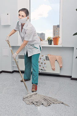 С тряпкой, шваброй, ведром с дезраствором