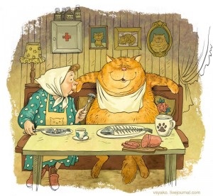 А рядом Мурзик рыбу ест,