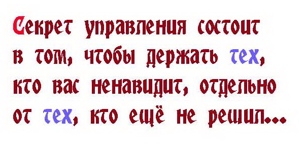 Я б вам сказала, замечательные люди, насчёт власти, к которой вы стремитесь "здесь и сейчас". См. Булгакова "Не умеете пить, а туда же". Я вот не умею пить, так я поэтому и не пью, то есть к власти не стремлюсь. И так-то было страшно, а когда вы, выйдя на новый уровень, стали на новом уже этом уровне друг другом управлять, то грешным делом была такая мысль, что лучше б вы сразу друг друга поубивали бы и отмучились.
