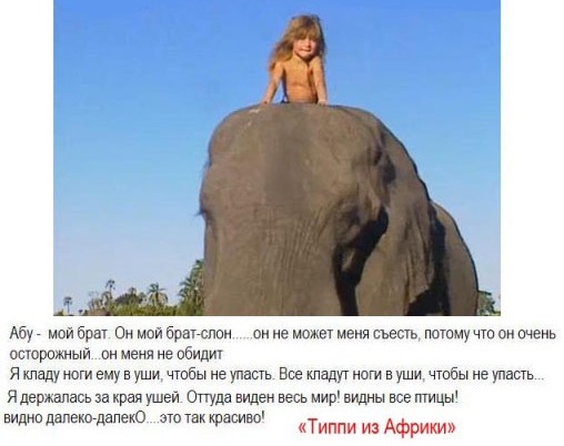 В качестве демонстрации к тому, о чём мой Абу Нагари советует задуматься, я взяла пример из фильма "Типпи из Африки". Фильм повествует о маленькой девочке, которая живёт в Набии и ладит со всеми представителями флоры и фауны. Этот фильм взволновал меня своей неподкупной чистотой. После него возникает тоска по возможно утраченному или несбыточному Раю. Однако после были публикации, в которых уже взрослая Типпи делится с миром о съёмках фильма. Разумеется, все животные надрессированы и подготовлены, чтобы не обидеть маленькое человеческое существо. Ну, и что? Разве нельзя было сразу догадаться?)))