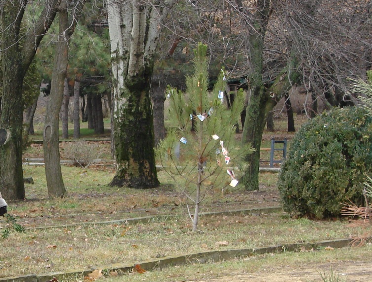 У парковой елки - нежданный наряд: