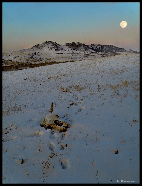 Зимний вечер в горах Бурятии. Луна реальная.