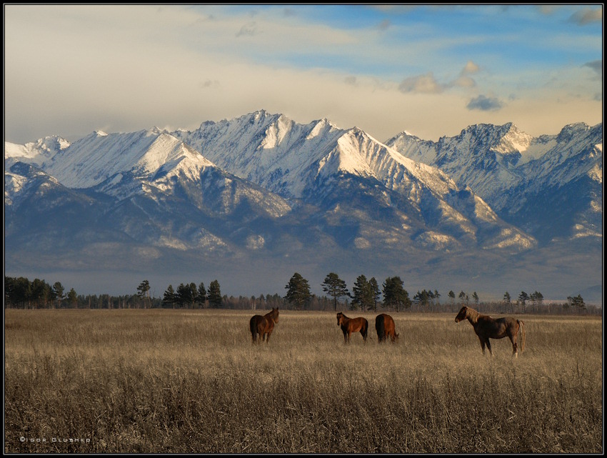 Свободнопасущиеся лошади у отрогов Восточных Саян. Бурятия. Ноябрь месяц.