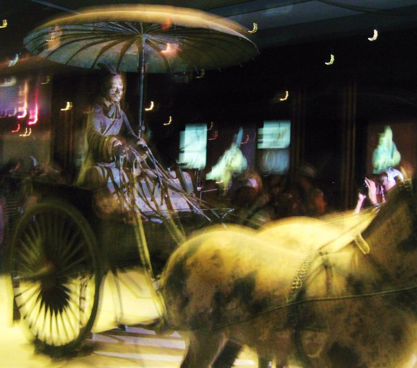 Во втором зале были расположены фигуры армейских чинов высшего ранга с лошадьми, а в третьем – две колесницы, запряженные лошадьми в натуральную величину. Один из возниц держал над головой парасоль, собранную из тысяч глиняных осколков! (см.фото). В боку каждой лошади есть дырочка, заткнутая деревянной пробкой. Это отверстие предохраняло фигуру лошади во время обжига, поскольку внутри все фигуры полые.