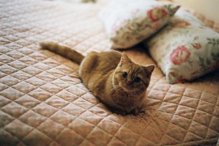 Кошка лезет на кровать,