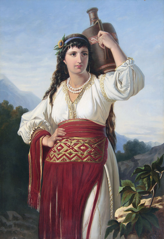 несёт глиняный кувшин на плече,