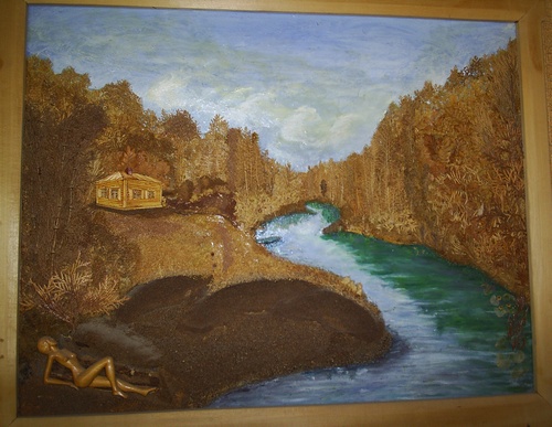 берег - сеяный песок, камешки, небо и вода - масляная краска...