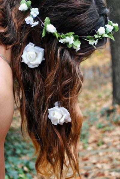 Россыпь белых цветов в волосах.