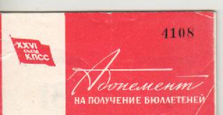 На снимке - редкая штука: абонемент,который выдавали делегатам 26 съезда КПСС. Мне подарил сие один казах-чабан,делегат этого съезда. Его звали Амир Тулегенов,царство ему небесное. У меня на этм сайте есть о нём рассказик,называется "МУХИ".