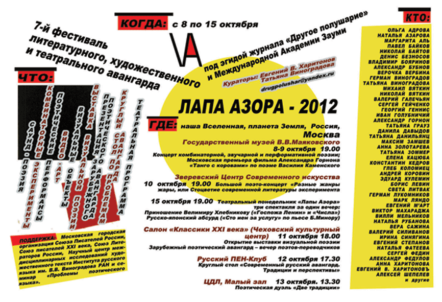 7-й фестиваль литературного, художественного и театрального авангарда, проводимого под эгидой журнала «Другое полушарие» и Международной Академии Зауми.