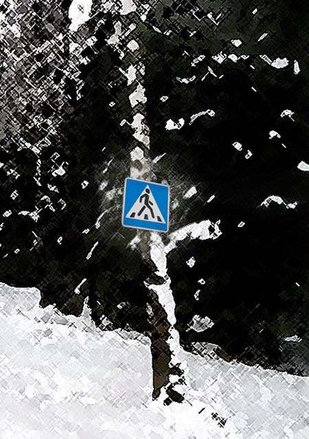 Наверное, все-таки наша полоска щербатого асфальта - это улица, потому что в нескольких местах висят дорожные знаки, указывающие, что тут переход. Привычной городской полосатой разметки, правда, возле них нет как нет. И правильно, потому что с другой стороны - лес-Берендеево царство. Согласитесь, что зебра, упирающаяся в частокол высоких елей и берез, смотрелась бы странновато. Как, впрочем, и знаки.