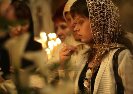 Кто-то робко (присутствием в церкви смущен).