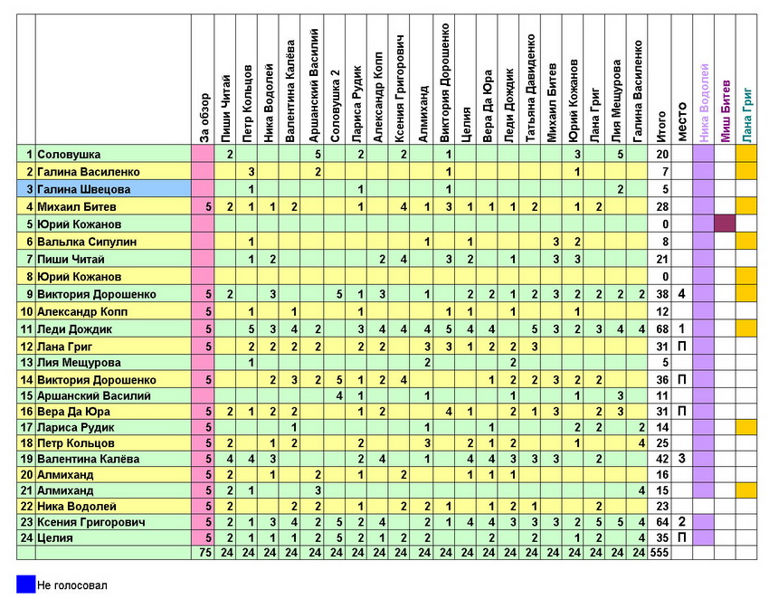 Главным угадайцем конкурса назначается НИКА ВОДОЛЕЙ, она получает 200 баллов за 100%!!!!!!!!!! угадывание всех активно прятавшихся авторов)).