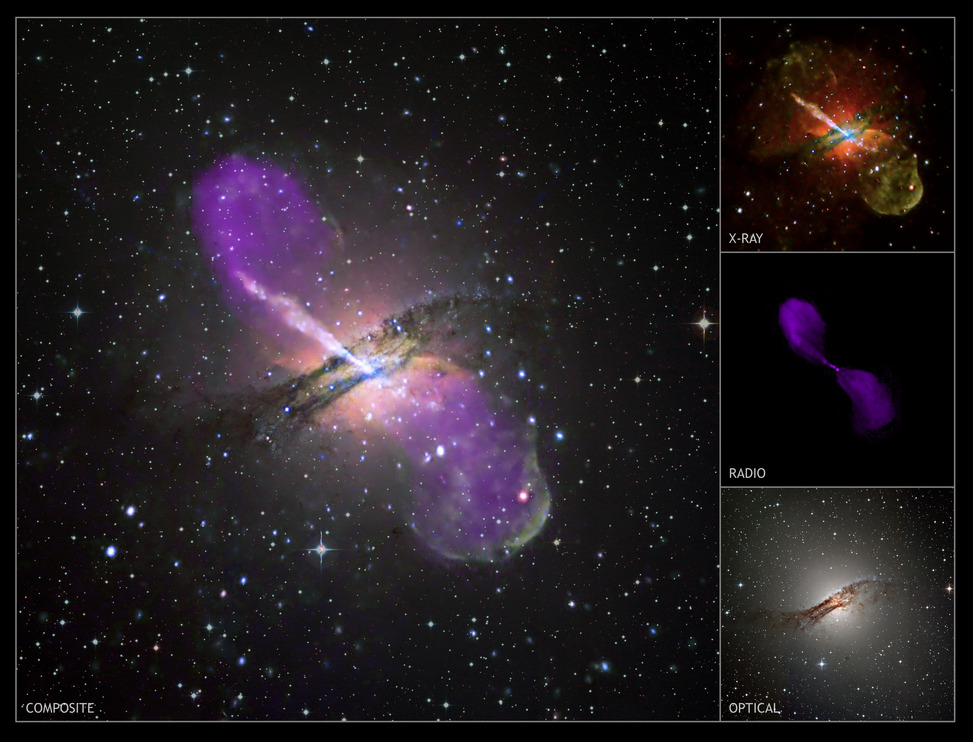 Иллюстрация : комбинированный снимок галактики в трёх диапазонах: рентгеновские лучи, радиодиапазон и видимое излучение.