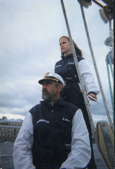 В нашей семье яхтсменов есть один ярко выраженный "джексономан" - 18-ти летняя дочь. Поэтому, когда стало известно, что ее кумир дает концерт в Москве, был, довольно остро поставлен вопрос о поездке в столицу. Однако, ехать туда - удовольствие дорогое: билеты на поезд (нечего и мечтать о самолете), проживание в гостинице плюс сумасшедшая цена самого билета на концерт - в общем, все это оказалось не по карману. В эти же дни выяснилось, что по пути М.Джексон выступает в столице Финляндии. Хельсинки - другое дело: своя яхта будет и средством передвижения, и крышей над головой, и провиант в трюмах. К тому же, нам было известно, что в гостевой гавани финского порта стоянка бесплатная. Итак, решено. Везем ребенка в Хельсинки. Штатная команда "Форварда" (именно так называется наш "однотонник"), "наевшаяся яхтой" за время весеннего ремонта, не изъявила особого желания идти в Финляндию, хотя визы были у каждого. Пришлось идти семейным вариантом состава, втроем: я - Галина, мама этого Фана, по имени Мила, ее папа - Боря, капитан яхты, и, естественно, сама вдохновительница плавания. 23 августа - день отхода. Народ ходит по берегу и удивляется ненормальному экипажу (т.е. нам): погода такая, что свист в стоячем такелаже и бешеное бряканье фалов о мачту отпугивают яхтсменов от выхода не то, что в дальний поход, но и на рядовую прогулку. Но семья Хрящевых - семья "яхнутых", и ни какая буря не помешает осуществлению заветной мечты главного члена экипажа. Отходим. В баке соляры всего 20 литров. Больше и не надо, т.к. двигатель не работает. Впрочем, иногда работает, но для этого приходится выпендриваться всей команде. Выглядит это так. Предварительно надо подсосом накачать топливо. Одновременно в другом конце включить массу, которая залипает, и ее, в момент схватывания двигателя, надо выключить, а затем, снова включить, не переставая подсасывать топливо. В кокпите рулевой ловит неуловимую нейтраль огромным разводным ключом (ручка реверса сломалась в начале навигации), и это он должен успеть сделать, стремглав перелетев через погон гика, от кнопки "стартера" (который заводится отверткой) и поменяв на лету отвертку на разводной ключ. Но так, как это может не сработать, одновременно идет работа на парусах: яхта должна быть управляемой. А поскольку это отход, то добавить надо работу со швартовыми и якорными принадлежностями. Вся эта работа выпала на троих. Отошли без проблем под одной Генуей. На ходу поставили грот. По закону подлости, идти приходится в лавировку. На траверзе Лисьего носа ломается звено ликпаза на штаг-пирсе. Приходится убирать геную. Идем под гротом. При подходе к Кроншлоту (для оформления пограничного и таможенного контроля), обилие судов на форватере не дает возможности сделать пару необходимых контргалсов и, въезжая в узкий проход, мы теряем наветренность и встаем, причем течение тащит нас на камни. Опережая приказ Бориса, достаю отпорник и успеваю упереться им в выступающие камни. Борис и Мила резко стравливают грот и, описав круг почти на месте, яхта, отделавшись легким ударом об один из камней, делает фордевинд, затем, набрав ход, на продолжении циркуляции делает оверштаг и входит в гавань. Пока я оформляю выход, Борис с Милой ремонтируют ликпаз. Поход возобновляется в 22:35 по Москве. "Форвард" идет под гротом и Генуей. До м. Стирсудена мы с Милой на вахте, затем иде