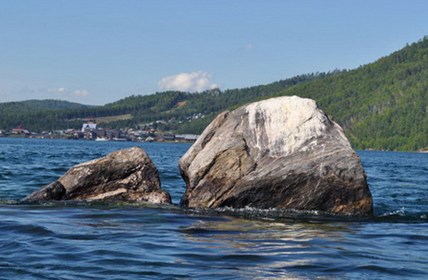 НА ФОТО из интернета: Шаманский камень в устье Ангары, на заднем плане посёлок Листвянка, что на берегу Байкала