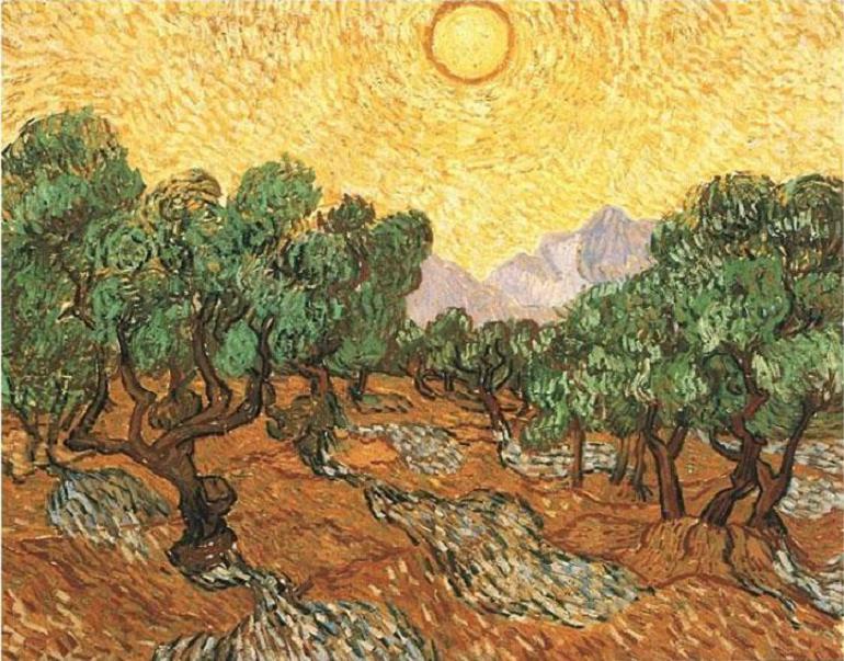 Ван Гог. Оливковые деревья с желтым небом и солнцем. 1889 г.