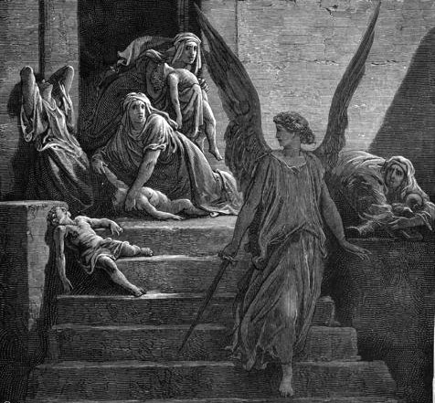 И созвал Моисей всех старейшин Израилевых и сказал им: выберите и возьмите себе агнцев по семействам вашим и заколите пасху; и возьмите пучок иссопа, и обмочите в кровь, которая в сосуде, и помажьте перекладину и оба косяка дверей кровью, которая в сосуде; а вы никто не выходите за двери дома своего до утра. И пойдет Господь поражать Египет, и увидит кровь на перекладине и на обоих косяках, и пройдет Господь мимо дверей, и не попустит губителю войти в домы ваши для поражения. Исход 12:21-23