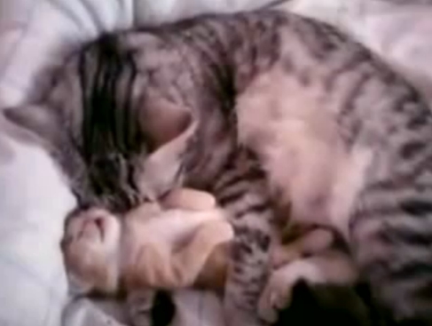 Обнимает мама кошка