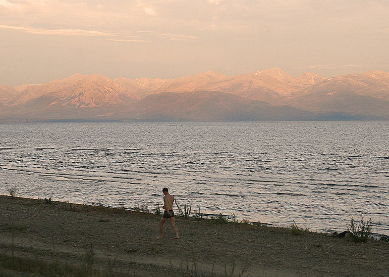 Идёт человек вдоль Байкала один на заре.