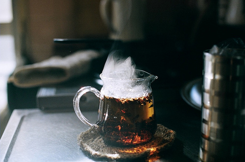 Она пьет зеленый чай в кафе