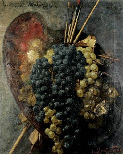 Палитра, кисти, спелый виноград