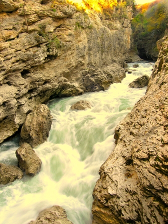 Речка «Бэла» вьётся и бежит вдоль скал.