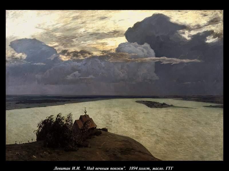 ««Над вечным покоем» - одна из самых значительных работ Левитана, о которой сам он писал в письме к Павлу Третьякову: "В ней - я весь. Со всей своей психикой, со всем своим содержанием..." Эту картину Левитан писал под звуки Траурного марша из "Героической симфонии" Бетховена. Именно под такую торжественную и печальную музыку рождалось произведение, которое один из друзей художника назвал "реквиемом самому себе".»