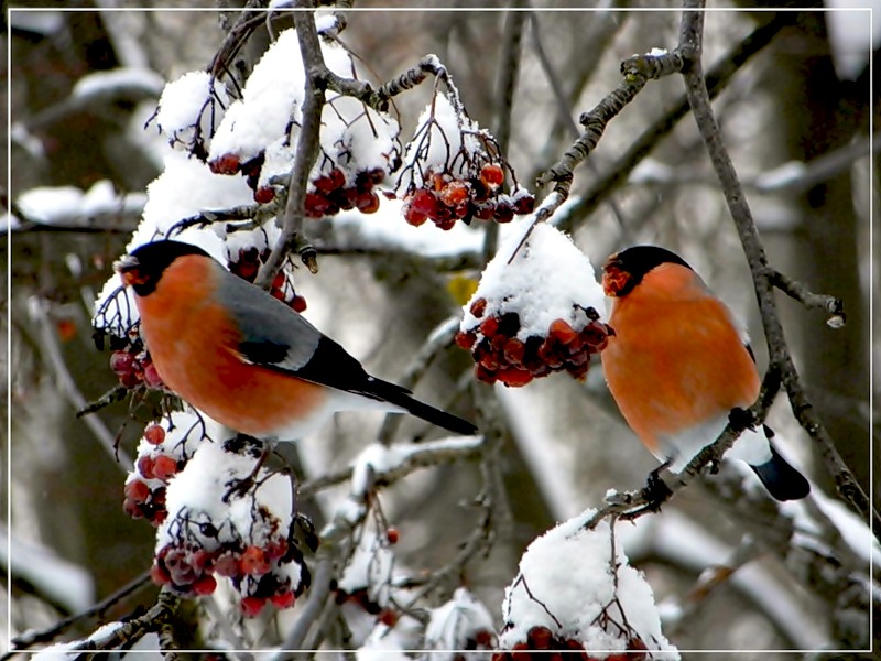 Расселись снегири на них, как ноты…