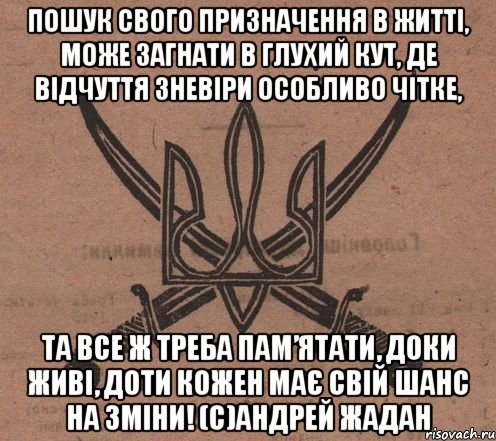 «Пошук свого призначення в житті, може загнати в глухий кут, де відчуття зневіри особливо чітке, та все ж треба пам’ятати, доки живі, доти кожен має свій шанс на зміни!»